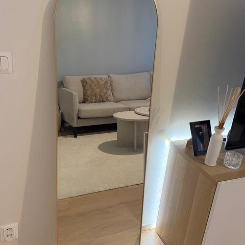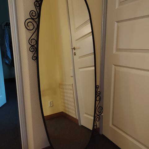 Myydään kaunis kokovartalopeili koristeellisella valkoisella kehyksellä.