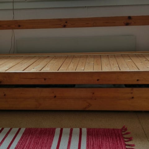 Mäntyinen laverisohva, ehjä/Siisti. Ei patjaa. 70x190 patja sopii sänkyyn.