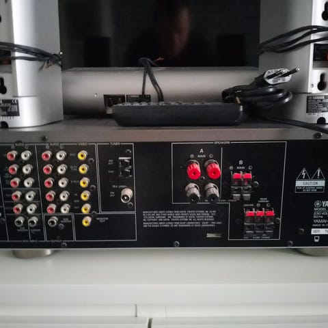 Yamaha RX-V463 AV-vastaanotin harmaa. Laite tarjoaa monipuoliset liitännät ja ominaisuudet audio- ja videotoistoon. Mukana käyttöohje. Ja kuvassa olevat kaiuttimet, sekä kaiutinjohtoja.