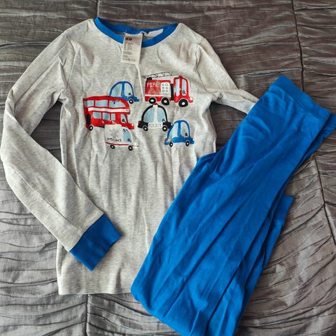 Uusi, vielä paketissa oleva yöpuku ja -housut koossa 130.