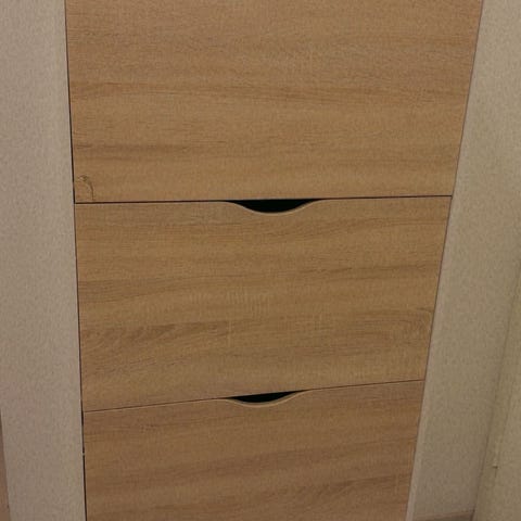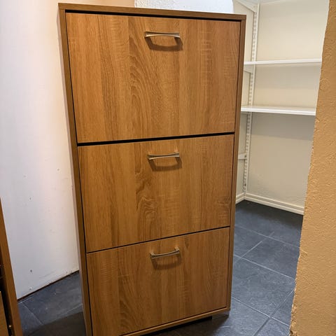 Myydään hyvänkuntoinen kenkäkaappi, jossa on kolme lipastoa.