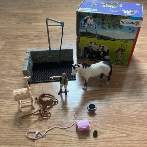 Schleich pesupaikka, hevonen hoitaja satula suitset tarvikkeet
