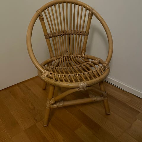 Kaunis lasten vanha rottinkituoli, käytetty. Istuinkorkeus noin 23 cm ja istuinleveys noin 25 cm.