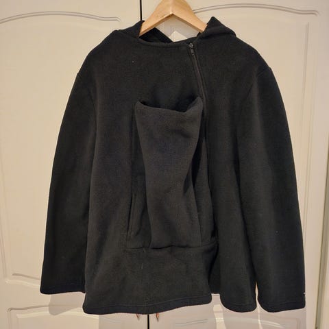 Äitiystakkina myös käytetty. Fleecehuppari, jossa myös vauvalle huppuosa ja jalkaosat. Voidaan siis käyttää kantoliinan tai kantorepun kanssa. Hupparissa itsessään ei ole kanto-osaa vauvalle, vain reikä päälle ja jaloille. Tummanvioletti, resorit mustat. Kahdet vetoketjut edessä. Koko XL.