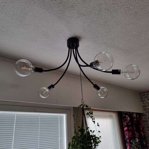Kuvan mukainen valaisin, halkaisija 90 cm, suurin korkeus 110 cm, runko-osa 50 cm. Lamppuja 12 kpl, E14 kannalla. Runko-osan kannake johon ketju tulee jouduttu tekemään uusiksi. Lamppujen varret taittuvat kasaan kuljetusta varten. Sisältää myös kattorasiaan tulevan valaisinpistokkeen. Vain nouto.