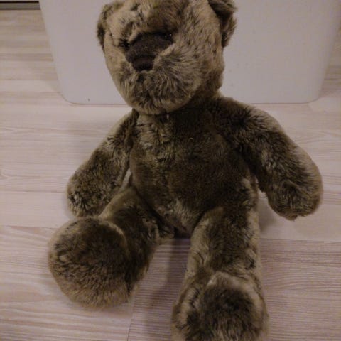 Nallepehmolelu harmaa, pehmeä, siisti ja ehjä. Pituus 42 cm, leveys 38 cm. Pesu jää ostajalle.