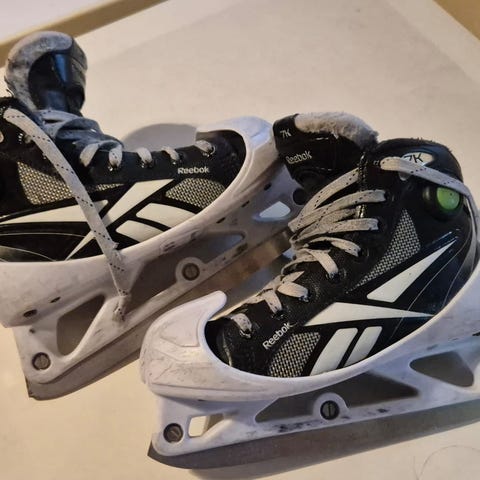 Reebok 6K Maalivahdin jääkiekkoluistimet, koko 44 (9) ja lesti E. Värit musta ja valkoinen. Käytetyt luistimet maalivahdille kuntokiekkoon. Luistimissa näkyy käytön jälkiä. Soveltuvat jääkiekkoharrastukseen kuntoilijoille. Pumppu ei toimi, mikä normaalia näissä malleissa, ei sinällään vaikuta käyttöön. Hyvässä terässä.