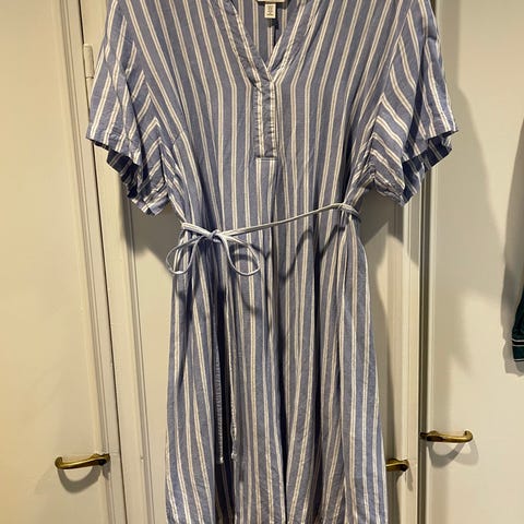 Lindexin vihreäraidallinen, viskoosinen äitiysmekko. Kunto muuten hyvä, mutta vähän on nukkaa tullut laukun kantokohtaan.