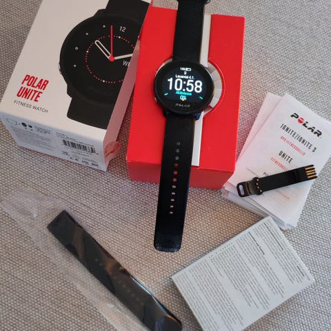 Polar Unite urheilukello, musta väri, mukana kaksi lataussovitinta. Kellossa on pyöreä näyttö ja se sopii monipuoliseen arkikäyttöön ja aktiiviseen elämäntapaan.