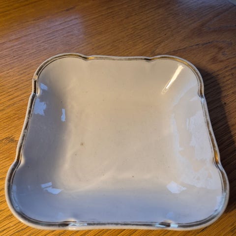Toisessa pienistä lautasista kultaus on oikein hyvässä kunnossa, mutta pinnassa on paljon krakeloitumaa ja värjäytymiä. Toisen pienemmän lautasen kultaus on hieman kuluneempi, tässäkin pinnassa krakeloitumaa mutta ei niin paljon värjäytymää. Nurjalla puolella pieni kolhu reunassa, ei näy päälle päin.