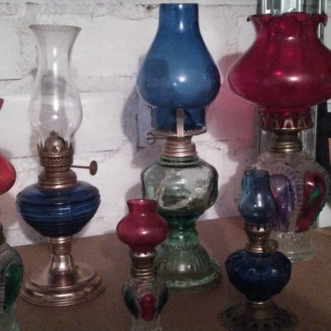 Punainen öljylamppu, valmistettu metallista ja lasista. Lampussa on kantokahva ja säätömekanismi liekin koon hallintaan. En ole testannut toimivuutta. Tämä on ollut vain koristeena. Korkeus noin 25cm.