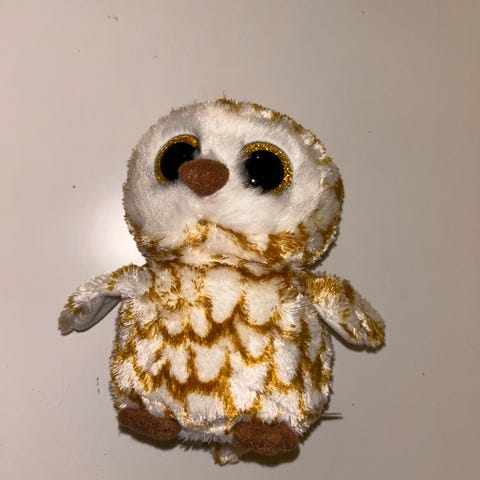 Ty pehmolelu pöllö, joka on valkoinen ja musta. Pehmolelu on pehmeä ja sopii lasten leikkeihin tai keräilyyn.