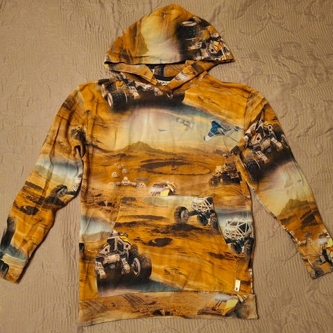 MOLO Romo Dinos huppari 140cm. Uutena ostettu ovh 55e ja erinomaisessa kunnossa. Itse kelpuuttaisin hyvin myös lahjaksi. Huppari on mukavaa hieman ohuempaa matskua, 95% luomupuuvillaa, 5% elastaania. Kaunis vihreäpohjainen dinosaurus kuosi. Pesty hajusteitta.