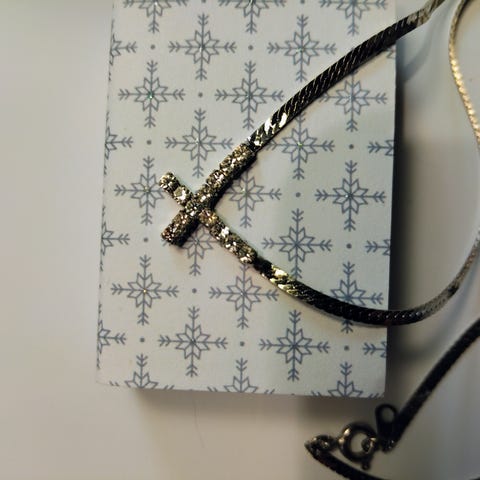Yli 20-vuotta vanha koru, mikä ei ole hopeaa. Hyvä kuntoinen, puhdistettu, hopean sävyinen kaulakoru, jonka ketjun pituus on n. 44 cm. Korun riipuksessa on keskellä kirkas kivi, jonka halkaisija on 6 mm. Riipuksen koko pituus 1,2 cm ja leveys 1,2 cm. Lukossa on tummuutta. Ketjun halkaisija 1 mm.