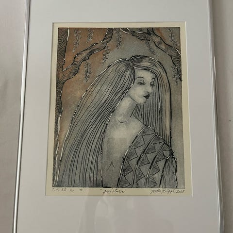 Kristina Elo Taidevedos, vuosimallia 2000. Kuvassa on penkki ja useita sammakkohahmoja, teos on signeerattu ja numeroitu 10/15. Teos on kehystetty.