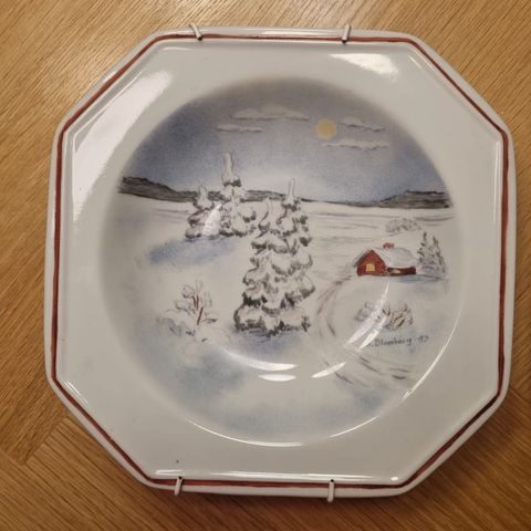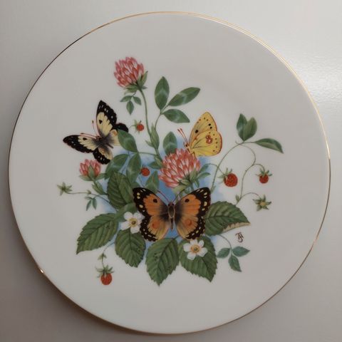 Koristeellinen seinälautanen, jossa on saksanpaimenkoira-aiheinen kuva. Lautanen on valmistettu posliinista, kultakoristeinen reuna. Hyväkuntoinen.
