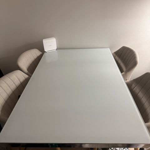 Musta teräsrunko, neljä tuolia valkoisilla istuintyynyillä.