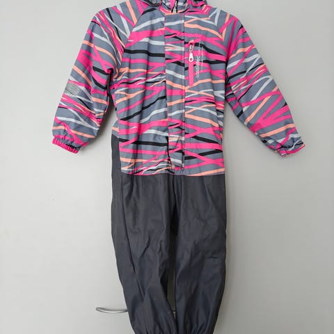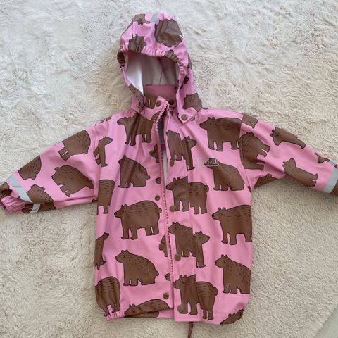 Liila lasten sadetakki, jossa on oransseja päärynäkuvioita. Hupullinen, Zaran merkki, koko 92. Erittäin tyylikäs ja hyväkuntoinen.