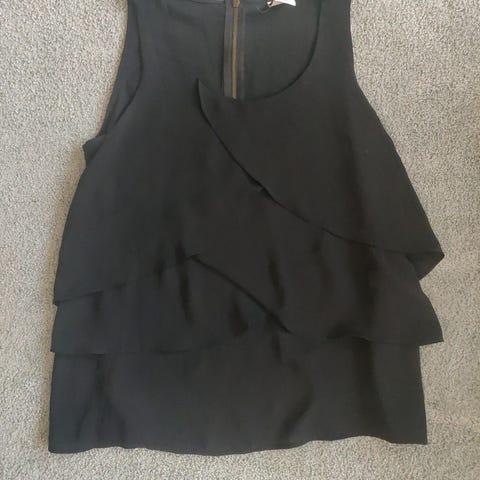 Myytävänä musta toppi missä edessä kirjontakuvioita.