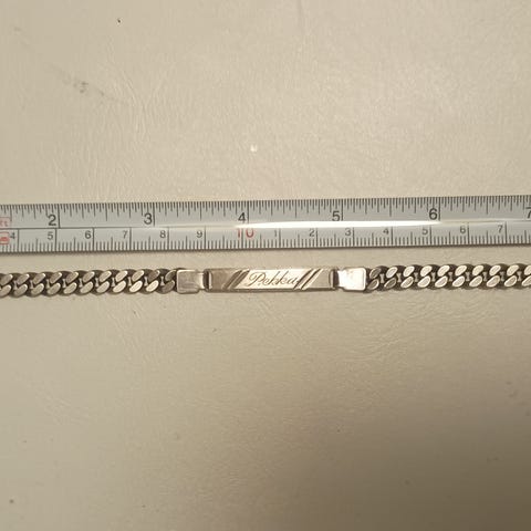 Painava ja iso rannekoru laatalla. 830 hopeaa. Hintaa alennettu kaiverruksen takia, jonka saa helposti poistettua koruliikkeessä jos haluaa. Laatta 4cm pitkä 1cm leveä