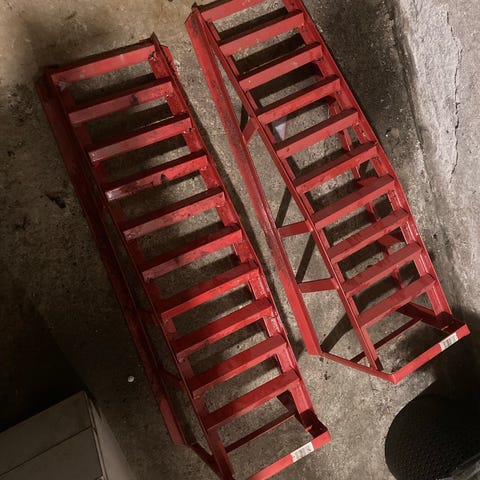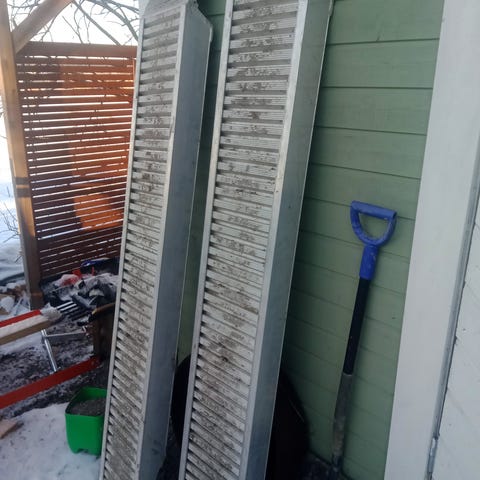 N.5m pitkät autorampit, ollu käytössä saksinosturille ajaessa.
