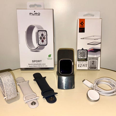 Suojattu kalvolla käyttöön otettaessa, Applen alkuperäistä ranneketta on käytetty vain muutamia tunteja, koska kelloa on pääosin käytetty erillisenä ostetulla rannekkeella. Akun kunto 97%.