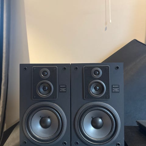 Vanhat ja tyylikkäät seinäkaiuttimet. 2-tierakenne, viritys hoidettu passiivisäteilijällä. Soivat kapineet, ripustukset tarkistettu.