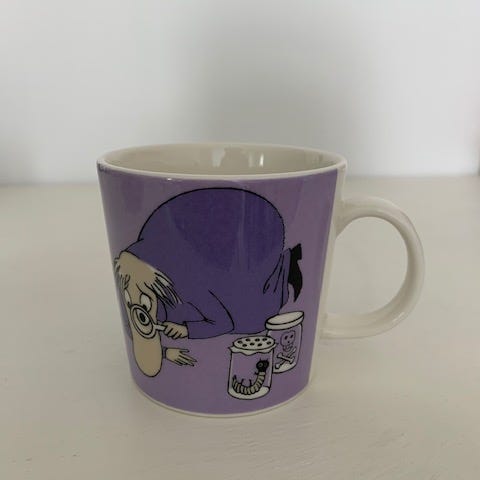 Violetti Hemuli-muumimuki oli tuotannossa vuosina 2004–2013. Kuin uusi, ei naarmuja. Tarraton