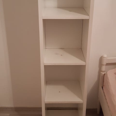 Pientä käytönjälkeä, ks kuvat. Ei lemmikkitalous. Voidaan purkaa osiin noutoa varten valmiiksi. Yhden hyllyvälin korkeus 41 cm.