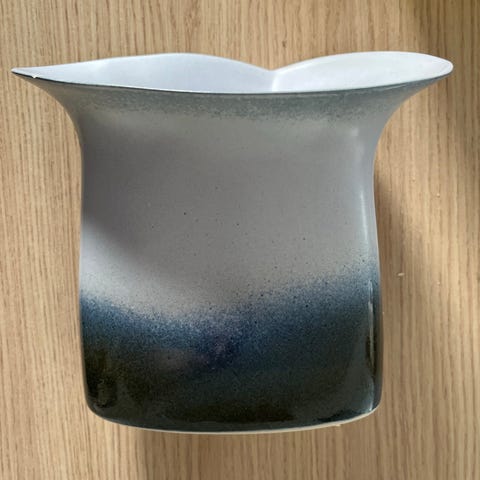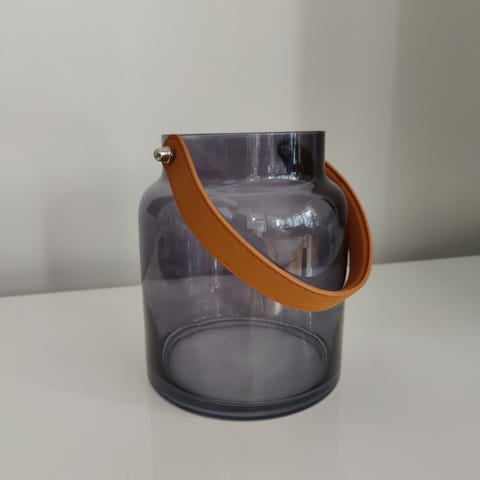 Vihertävä seinämaljakko/teline, ripustuslenkki nahkaa, mitat 24x12x6 cm.