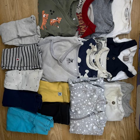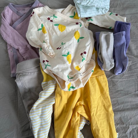 Tytöllä käytössä olleita vauvan vaatteita: