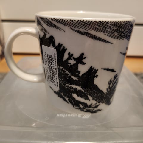 Tuotannosta poistunut käyttämätön ja tarrallinen Seikkailu-muumimuki.