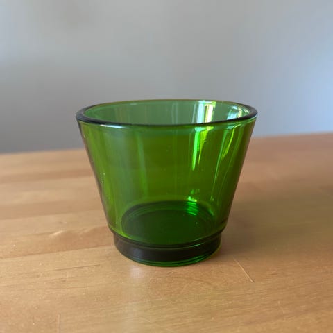 Uudenveroinen lilanvärinen tuikkuastia. Korkeus 9 cm, läpimitta 8 cm. Paksu pohja.