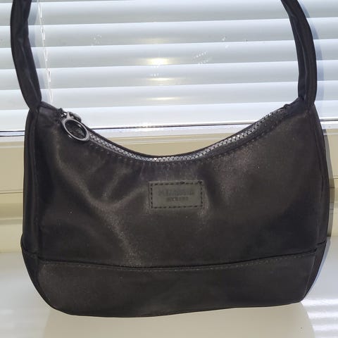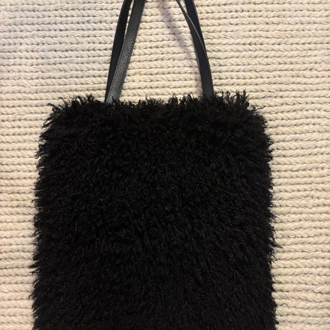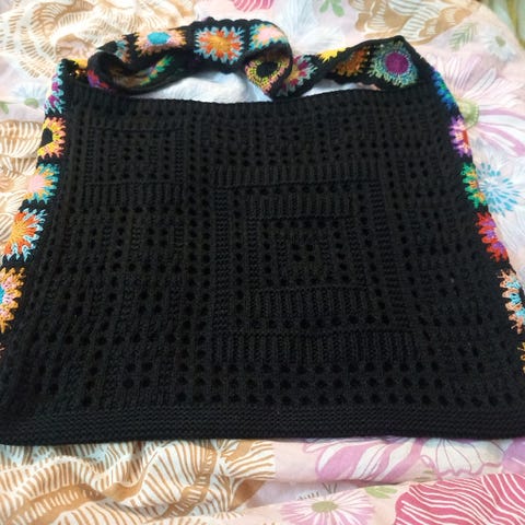 Kaunis musta itse neulottu laukku. Leveys noin 33cm, korkeus noin 27cm, olkahihnan kanssa noin 46cm.