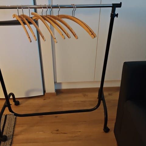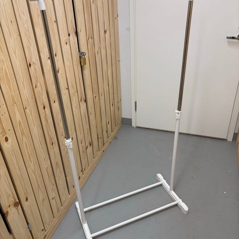 Vaateteline kahdella hyllytasolla, päädyissä naulakkonupit. Teline on aikoinaan mennyt rikki muutossa ja liimattu kasaan (katso kuvat). Tämän vuoksi telinettä ei saa täysin purettua osiin. Muutoin teline on hyvässä kunnossa.