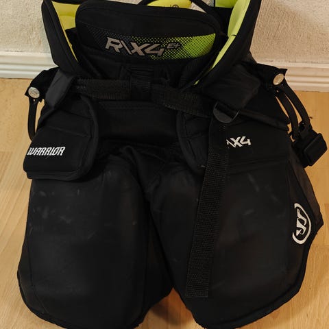 Warrior RX3E+ maalivahdin housut INT L/XL. Suojaavat ja muuten ok kuntoiset, mutta toinen pieni suoja, pehmuste edessä kaipaa ompelukonetta. Normaalia kulumaa. Käyttöikää on vielä näppärälle fiksarille. Itsellä ei halua eikä taitoa paikkailla. Postitus onnistuu.