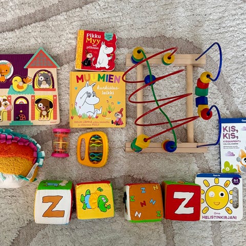 Myydään yhtenä pakettina seuraavalle pienelle ihmiselle. Kaikki lelut laadukkaita ja ostettu tunnetuista kaupoista. Lelut ovat olleet meillä käytössä noin 6 kk ikäisestä eteenpäin. Parivuotias on nyt valmis luopumaan näistä (kirjat soveltuvat vanhemmillekin toki).