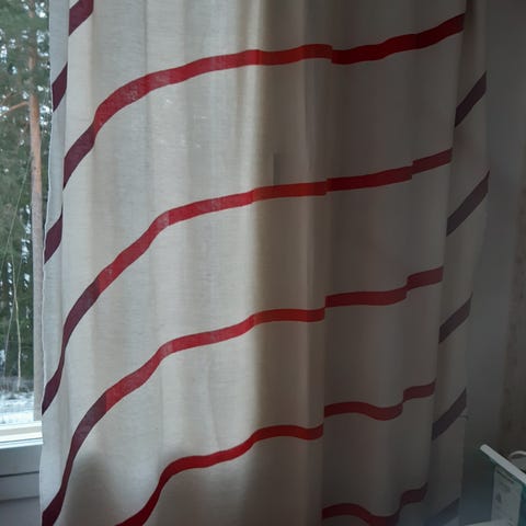 Valkoiset, maalaisromanttiset verhot, joissa kaunis kuvio ja teksti yläosassa. Verhot ovat 100% puuvillaa. Verhoja ei ole koskaan käytetty, koska eivät sopineetkaan meille. Näitä on kaksi samanlaista ja yhteishinta on 25e.