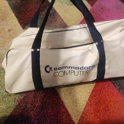 Retro 1980- luvulta oleva kaulahuivi Commodoren logolla.