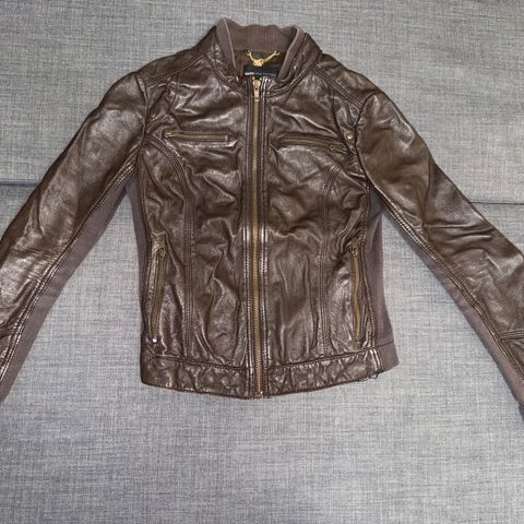 Ostettu muutamia vuosia sitten Mangosta. Pehmeää nahkaa. Niitit kauluksessa, olkapäillä ja taskujen suilla. Vetoketjut hihansuissa. Pientä kulumaa, ajan patinaa kyynerpäissä ja saumoissa. Vuorikankaassa selässä ompeleen kohdalla hieman venymää. Muutoin siisti.