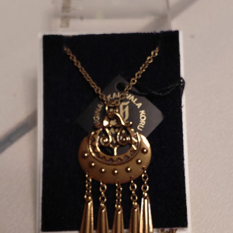 Germud Paaerin suunnittelema pronssinen viikinkiaiheinen kaulakoru. Riipuksen koko 72mm x 48mm. Kaulaketju 71cm ilman lukkoa. Tarinalappunen mukaan. Käytetty vintage koru, lähetän ToriDiili postituksessa. Huom. liikkeissä hinnat 150-190eur. Mahdollista ostaa myös mobilepay + postit ostajalle.