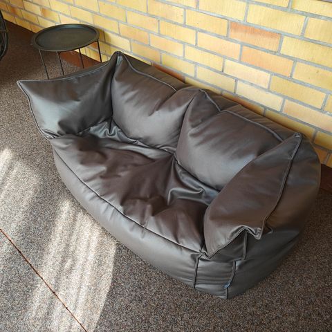 Nahkainen säkkituoli, ehjä, väri musta/beige. Jalkapallo-teema. Tarvii lisää täytettä.