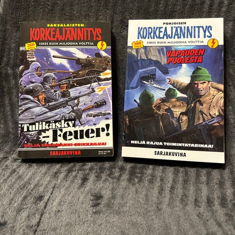 Korkeajännitys Sivut sarjakuvakirjat, sisältäen useita toimintahistoriaa kuvaavia tarinoita. Kirjat ovat suomenkielisiä ja sisältävät neljä rajua toimintatarinaa, kuten 'Pommikoneen Kirous' ja 'Koiratappelu" Soveltuvat sarjakuvien lukemiseen ja keräilyyn.