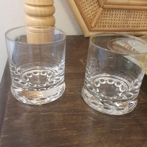 Lasi korkeus 6 cm, pohjan halkaisija 6,4 cm, pieni suun särö.