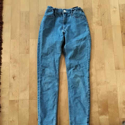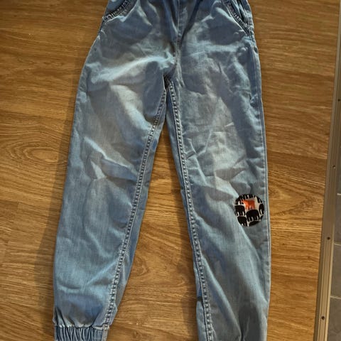 Myydään HM siniset pehmeät Jogger-farkut, koko 140. Reikä toisessa lahkeessa (kuva), huomioitu hinnassa.