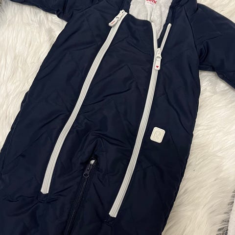 Reiman talvihaalari. Karhu ja pallokuosit. Koko 68/74, mutta menee vielä 80 cm. Haalari muuntuu vetoketjulla pussiksi. Käännettävät hihat ja lahkeissa napit. Kunto erinomainen.