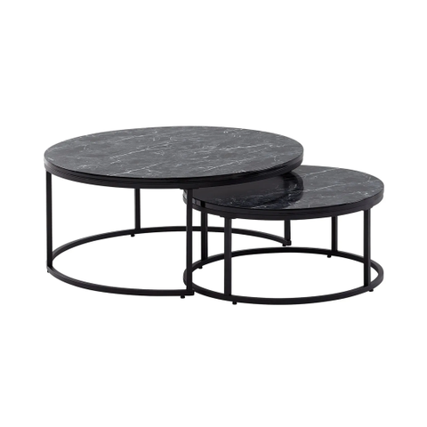 Kaksiosainen Wilhelm-sarjapöytä. Pöydät toimivat niin yhdessä kuin erikseen. Valmistusmateriaaleina metalli ja MDF.
