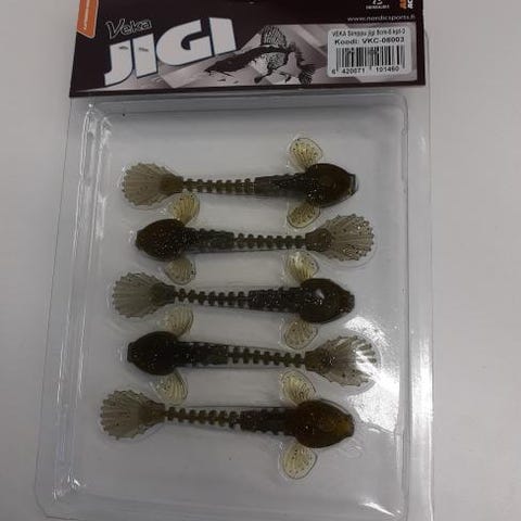 Veka Simppu jigi 8cm 5kpl jigi Veka Simppu -jigi jäljittelee tehokkaasti pohjassa asuvaa simppua. Lisäksi se toimii hyvin myös vertikaalissa ja silloin kun tarvitaan eläväuintista jigiä. Saatavilla eri värisinä. Jigissä on erittäin pehmeä ja kestävä materiaali. Paino: n. 4 g Pituus: 8 cm 5 kpl blisterpakkaus
