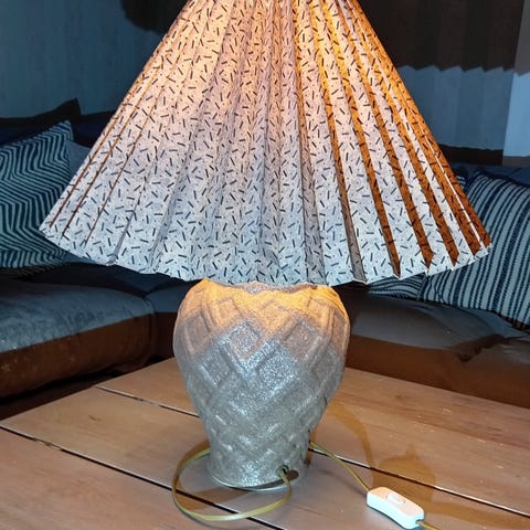 Tukeva pöytälamppu metallijalalla ja mustalla varjostimella. Jalka valettu ilmeisesti messingin ja raudan seoksesta. Ostettu aikoinaan kierrätyskeskuksesta jossa sähköt on myös tarkistettu (siitä myös jäljellä tarra). Meillä ei tullut pidempään käyttöön koska ei sopinutkaan sitten meidän erityiskapeille ikkunalaudoille. Kuvissa eri vaihtoehtoja lämpimällä sekä kylmällä lampulla.