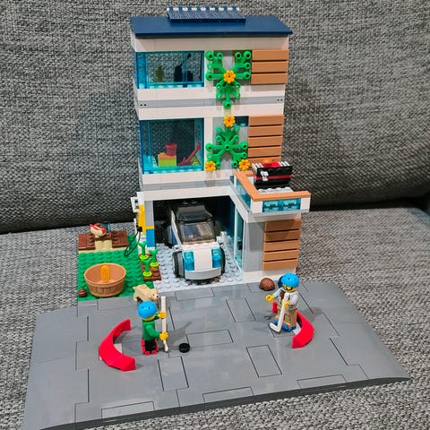 Myydään pieni pinkki Lego talo. Mukana kuvassa näkyvät osat (auto puuttuu). Ohje löytyy, mutta laatikko ei.